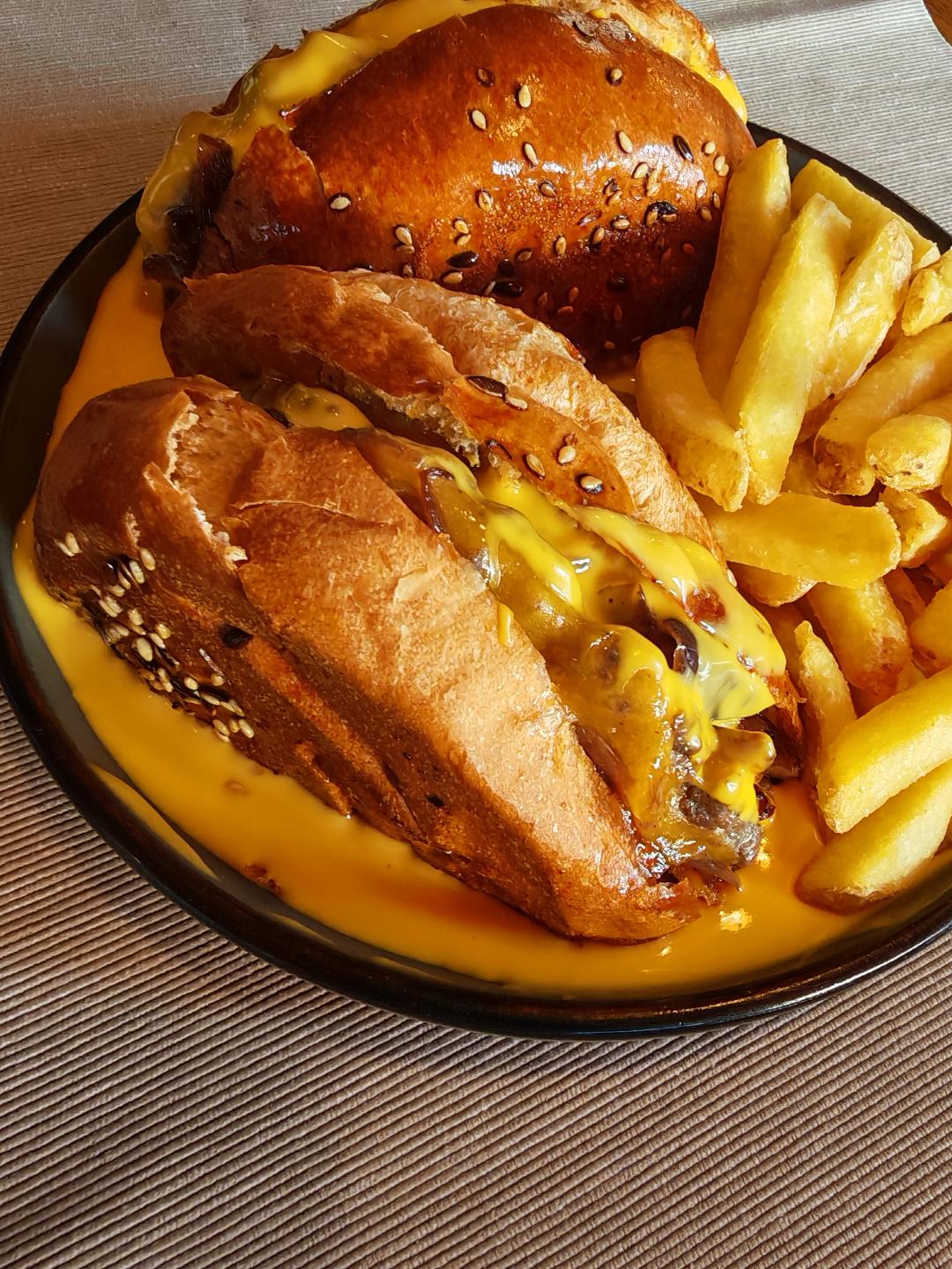 chiflă, carne de vită, ceapă caramelizată, ceddar topit, cartofi prăjiți